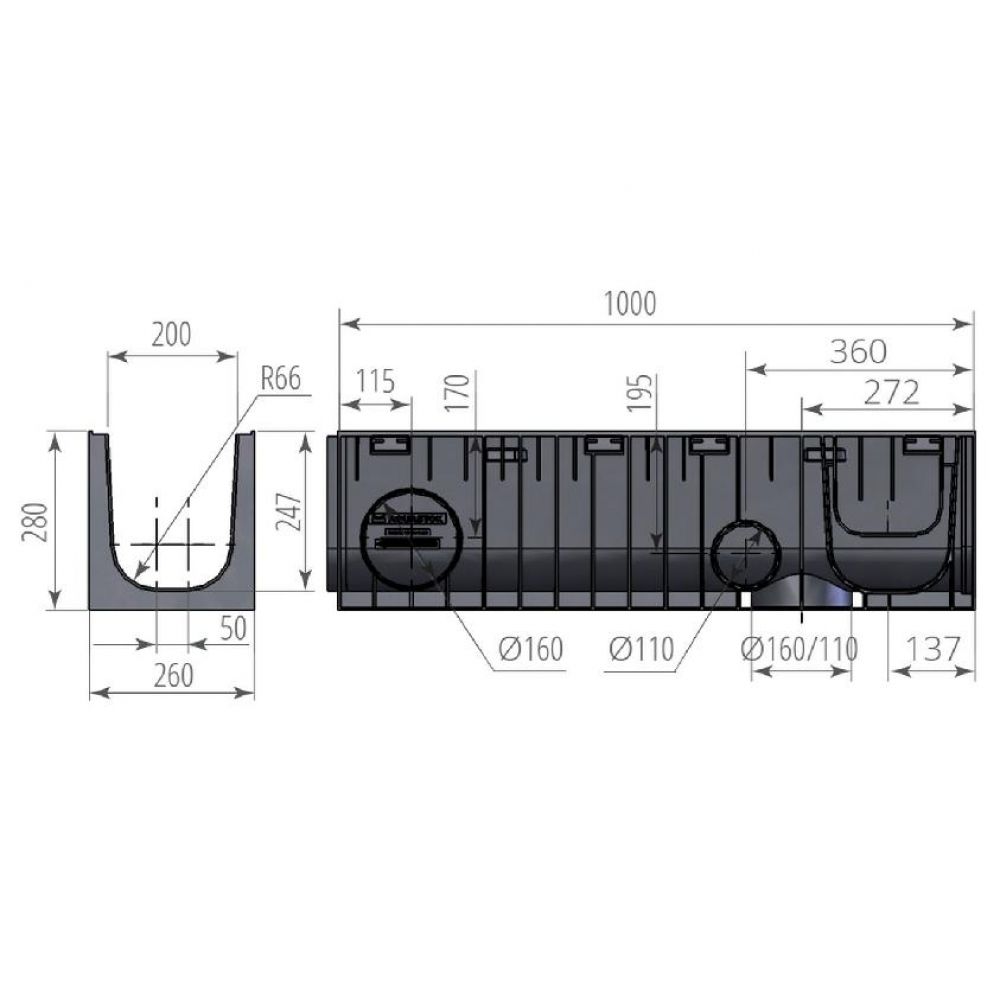 Лоток водоотводный пластиковый ЛВП Норма 200 Н280 от производителя Аквасток по цене 1 980 р
